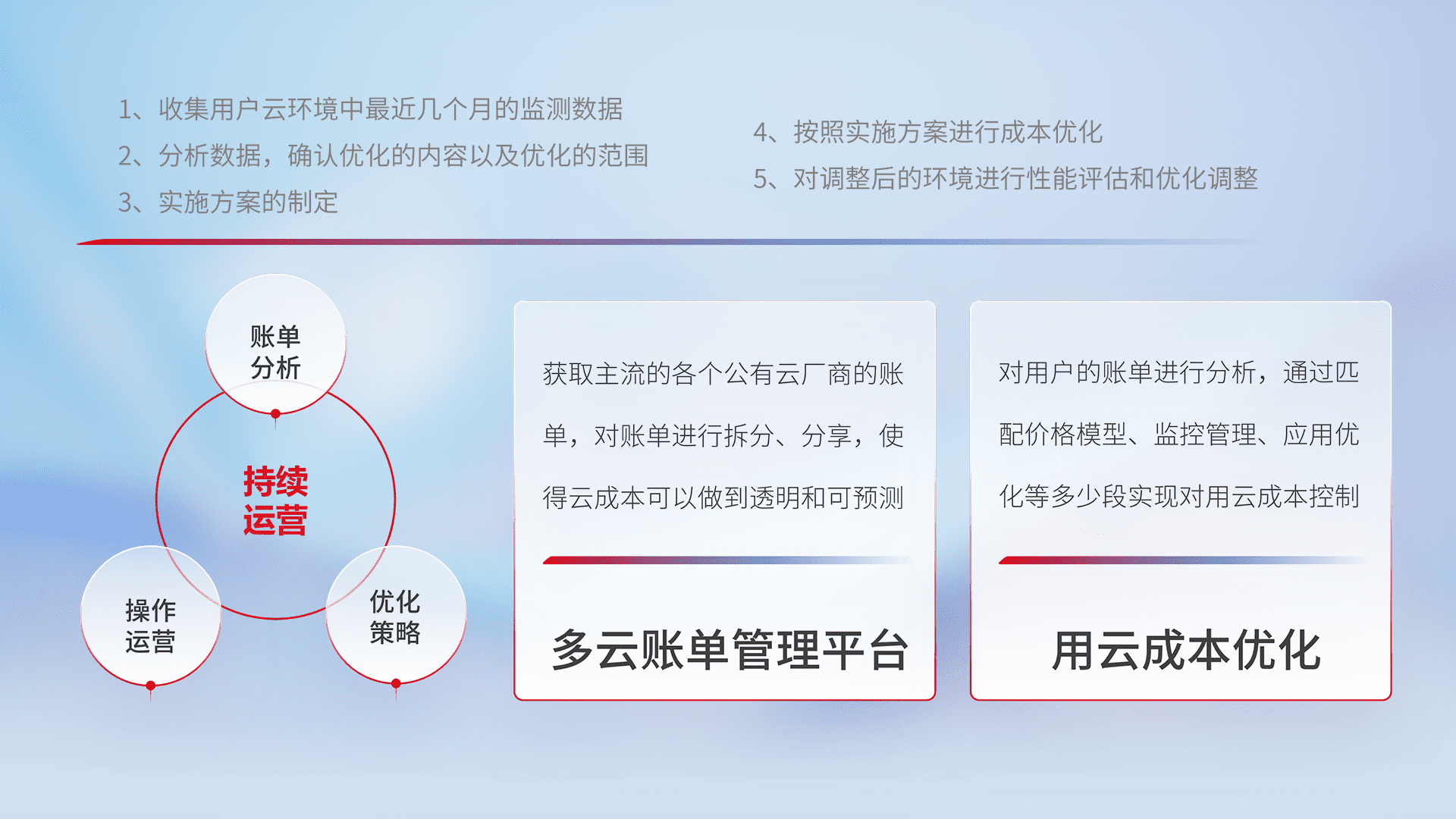 通过多云纳管,,,,以统一的资源数据模型把客户的云资源进行抽象和封装,,,,进而实现对多云资源的统一操作,,,保障云资源管理的可靠性、、、、稳定性与可用性。。。量身定制化运维内容,,配置、、、开发运维、、补丁管理、、、备份、、、监控、、、、认证和访问管理、、、审计和日常巡检等,,,,保障在用云过程中的可靠度,,,,稳定度以及高可用率。。
